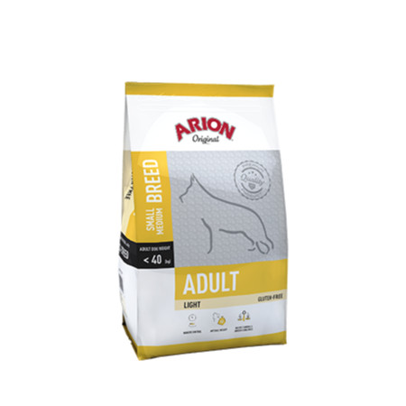Arion Original Adult Small Medium Light dedykowana jest dorosłym psom małych i średnich ras o masie ciała do 40 kg z tendencją do nadwagi. W pełni zbilansowana, bezglutenowa karma została specjalnie dostosowana do potrzeb żywieniowych psów małych i średnich ras zmagających się z otyłością. Wpływa na poczucie sytości, pomagając utrzymać idealną wagę Twojego pupila Głównymi składnikami są kurczak i ryż, bez dodatku kukurydzy, pszenicy czy soi.