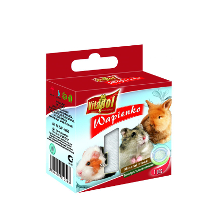 Kostka wapienna naturalna dla gryzoni i królików. Mineralne uzupełnienie codziennej diety w wapń, który jest niezbędny dla prawidłowego rozwoju, wzrostu i życia oraz odpowiada od początkowych dni życia za prawidłowy wzrost kości, zębów i innych struktur wymagających obecności tego minerału. Zapobiega krzywicom. Do zawieszenia w klatce.