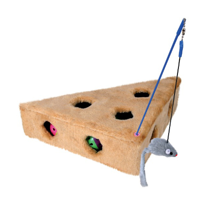 Zabawka dla kota w kształcie sera z wędką i piłeczkami. W środku znajdują się trzy grzechoczące piłeczki, na które kot może polować poprzez otwory. Dodatkowo w zestawie wędka dla kota z pluszową myszką.