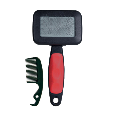 Miękka szczotka z gumową rączką dla psów i kotów, odpowiednia do pielęgnacji szaty większości ras, w tym długowłosych, krótkowłosych i szorstkowłosych oraz z włosem kręconym. Zapewni delikatną pielęgnację zewnętrznej i wewnętrznej warstwy sierści. W komplecie szczoteczka do czyszczenia.
