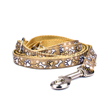 Smycz dla psa z wytrzymałej taśmy nylonowej z motywem łapek i kostek. Stanowi idealne dopełnienie do obroży z tej samej serii.
