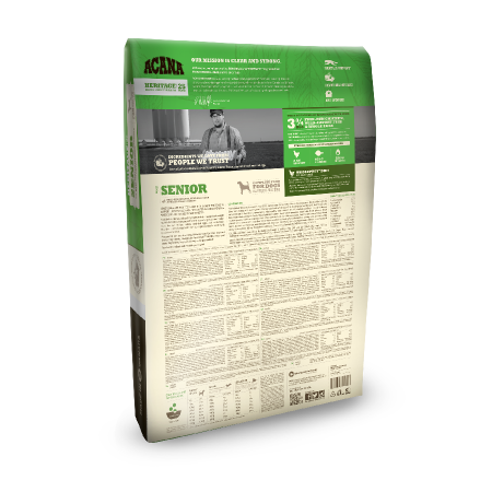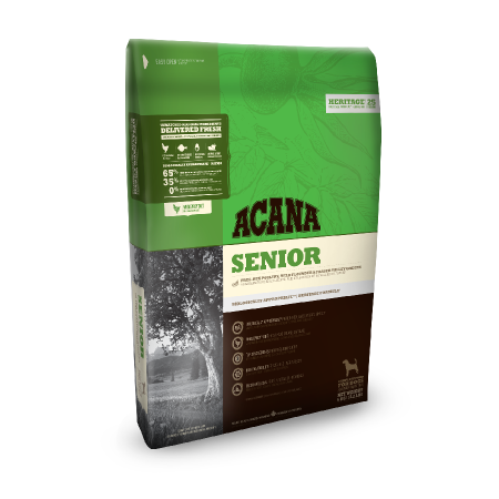 Acana Senior Dog dedykowana jest wszystkim psom powyżej 7. roku życia. Starszym psom najlepiej podawać karmę bogatą w białko zwierzęce, aby wesprzeć masę mięśniową, lecz o ograniczonej ilości węglowodanów, których nadmiar może prowadzić do otyłości i cukrzycy.