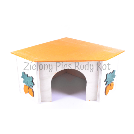 Drewniany domek narożny przeznaczony dla gryzoni. Estetycznie wykonany. Zapewni zwierzątku przytulne miejsce odpoczynku.