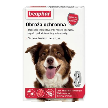 Beaphar obroża ochronna przeznaczona dla psów średnich i dużych ras. Wodoodporna obroża przeciwko ektopasożytom, chroni psa przed pchłami, kleszczami, meszkami i komarami.