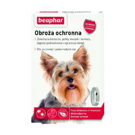 Beaphar obroża ochronna przeznaczona dla szczeniąt i psów małych ras. Wodoodporna obroża przeciwko ektopasożytom, chroni psa przed pchłami, kleszczami, meszkami i komarami. Do stosowania samodzielnie lub razem z kroplami Vermicon Line-on.