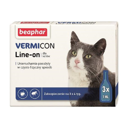 Beaphar Vermicon Line-on krople dla kotów i kociąt powyżej 12. tygodnia życia. Chronią zwierzę przed ektopasożytami, takimi jak pchły, kleszcze, wszy, muchy i komary. Vermicon nie zawiera żadnych chemicznych środków owadobójczych, obezwładnia pasożyty w czysto fizyczny sposób.