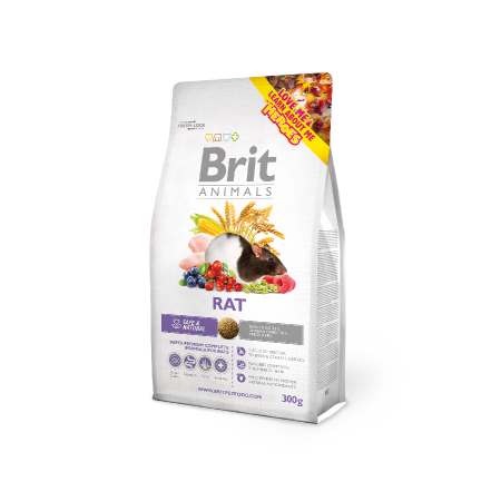 Brit Animals Rat Complete to pełnoporcjowa ekstrudowana karma dla szczura klasy super premium. Formuła karmy działa korzystnie na sierść, a także wspomaga odporność i trawienie. Nasiona lnu poprawiają kondycję futra i nadają połysk. Zawiera wyciąg z Juki Schidigera. Jęczmień i owies stanowią 32% karmy, lucerna i marchew 15%, kurczak 10%.