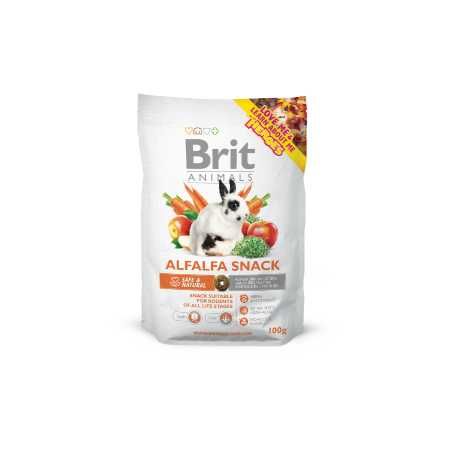 Brit Animals Alfalfa Snack to smaczna i zdrowa przekąska dla gryzoni i królików na każdym etapie życia. Działa korzystnie na uzębienie i futro Nie zawiera cukru i jest niskokaloryczna - nie przeciąża organizmu Lucerna stanowi 38%, pszenica 27%, jęczmień 26%, owoce 5%, warzywa 2%, siemię lniane 2%.