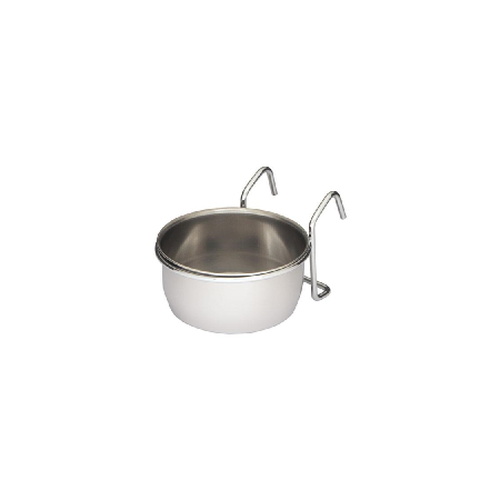 Miska dla ptaków do zawieszenia w klatce. Miskę łatwo utrzymać w czystości, dzięki temu, że można ją łatwo wyjąć z obręczy mocującej.